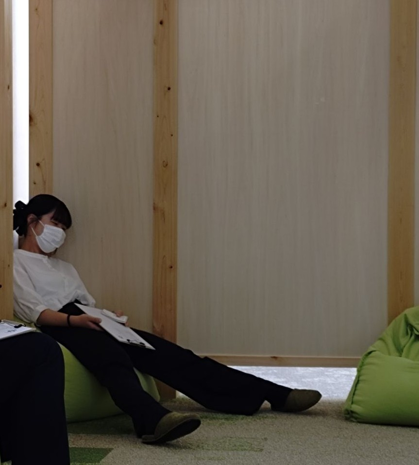 ・ワンモア森之宮での取り組みを教えていただいたり、ストレス発散方法を考えたり、色々な場所に設置してある椅子の座り比べの体験をしました。
