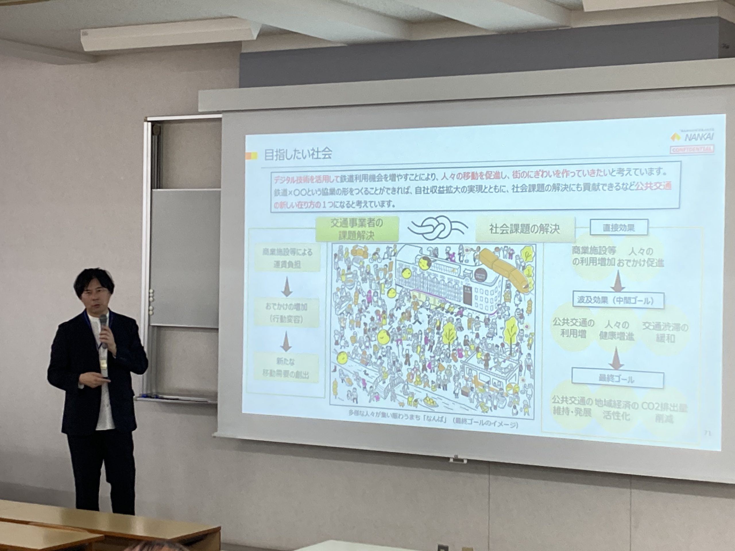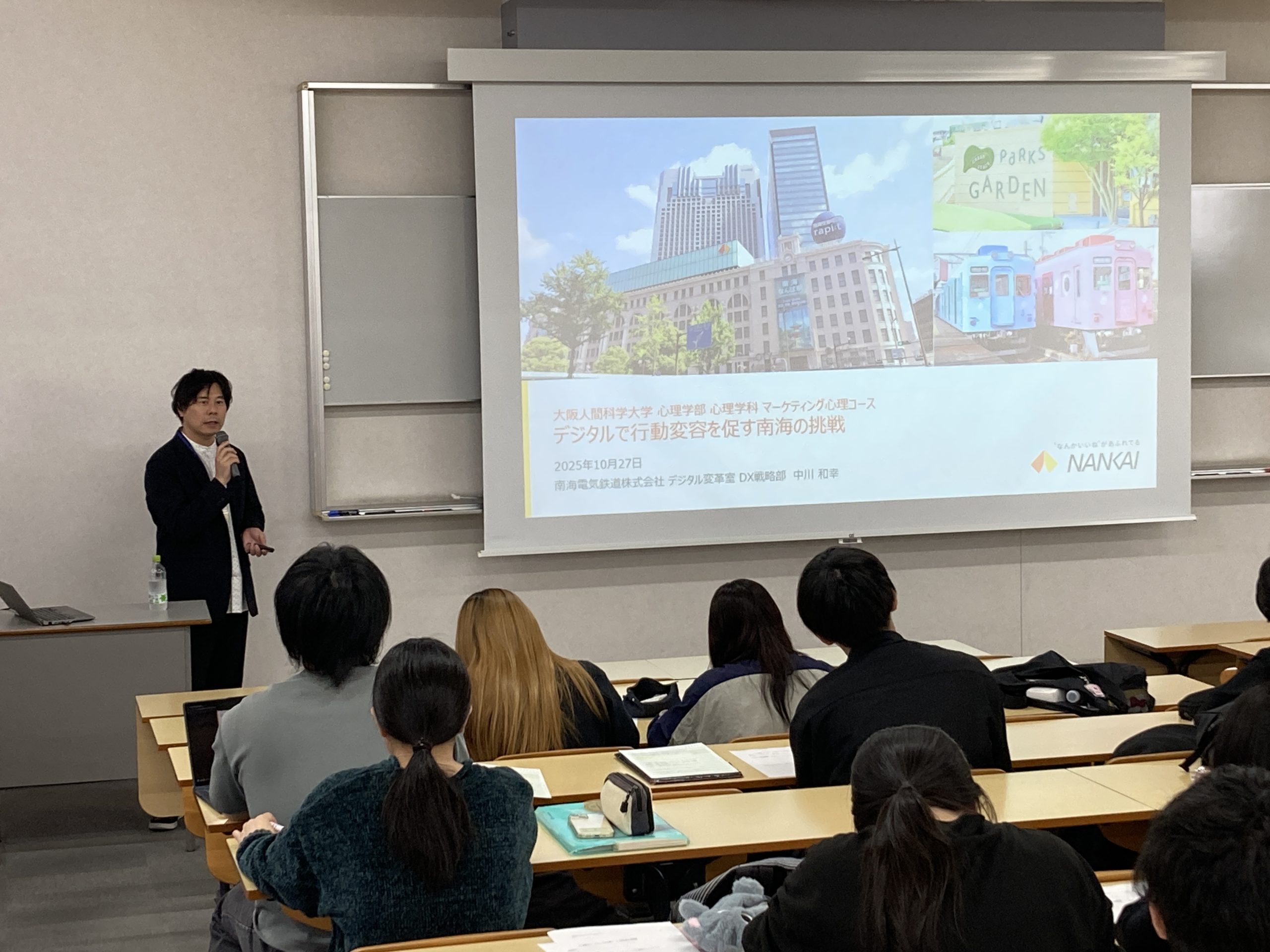 2年次生対象のプレ演習Ⅱ(マーケティング心理コース)では、南海電気鉄道株式会社様(以下南海電鉄様と表記)から3名の外部講師をお招きして、これまで南海電鉄様が培ってきた「ブランディング」や「マーケティング戦略」等を学ぶ授業を10月13日より10月27日まで3回連続行いました。