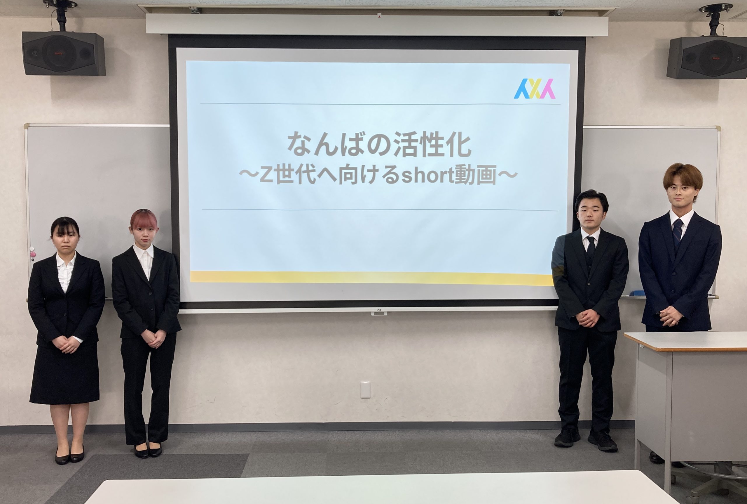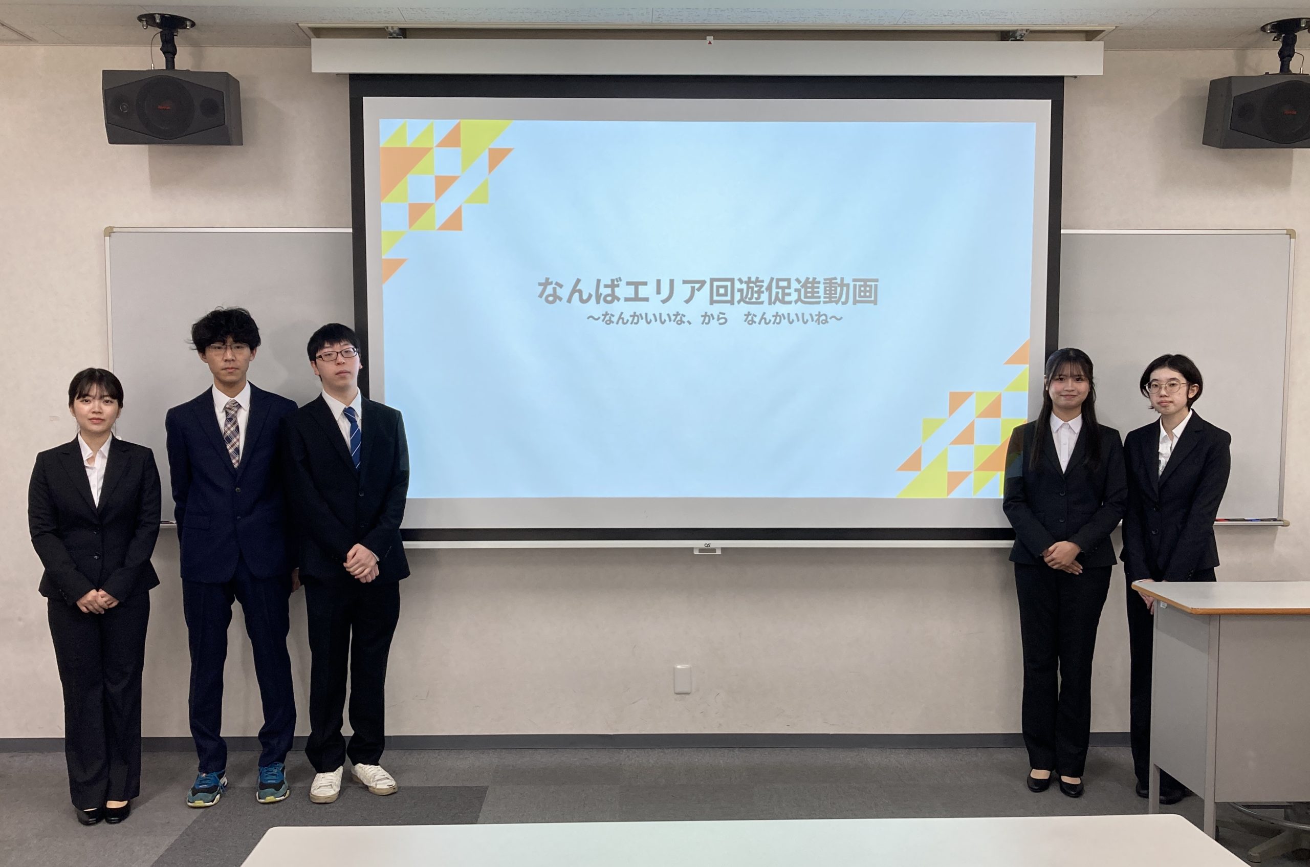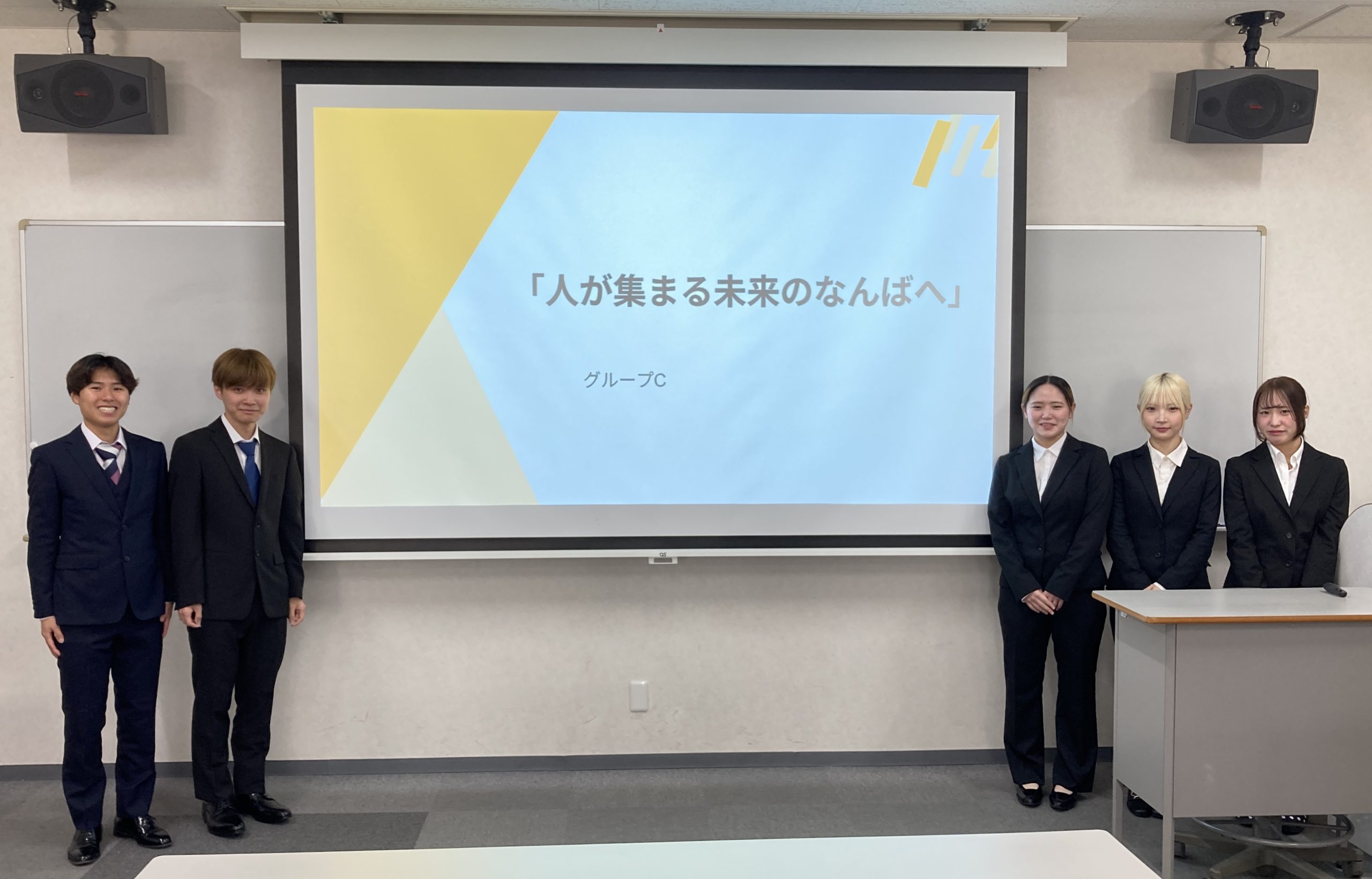 提示いただいた課題(short動画により「なんばエリア回遊を促す」)に対して、これまで中間発表を経て、各グループで動画作成を含む解決案を策定し検討してまいりました。今回、南海電気鉄道株式会社ブランド&コミュニケーション部 部長 渡辺幸代 様、ブランド&コミュニケーション部 課長 常本雄介 様、株式会社ZIK 代表取締役 前田啓太 様をお迎えし、総括の課題解決提案を行いました。