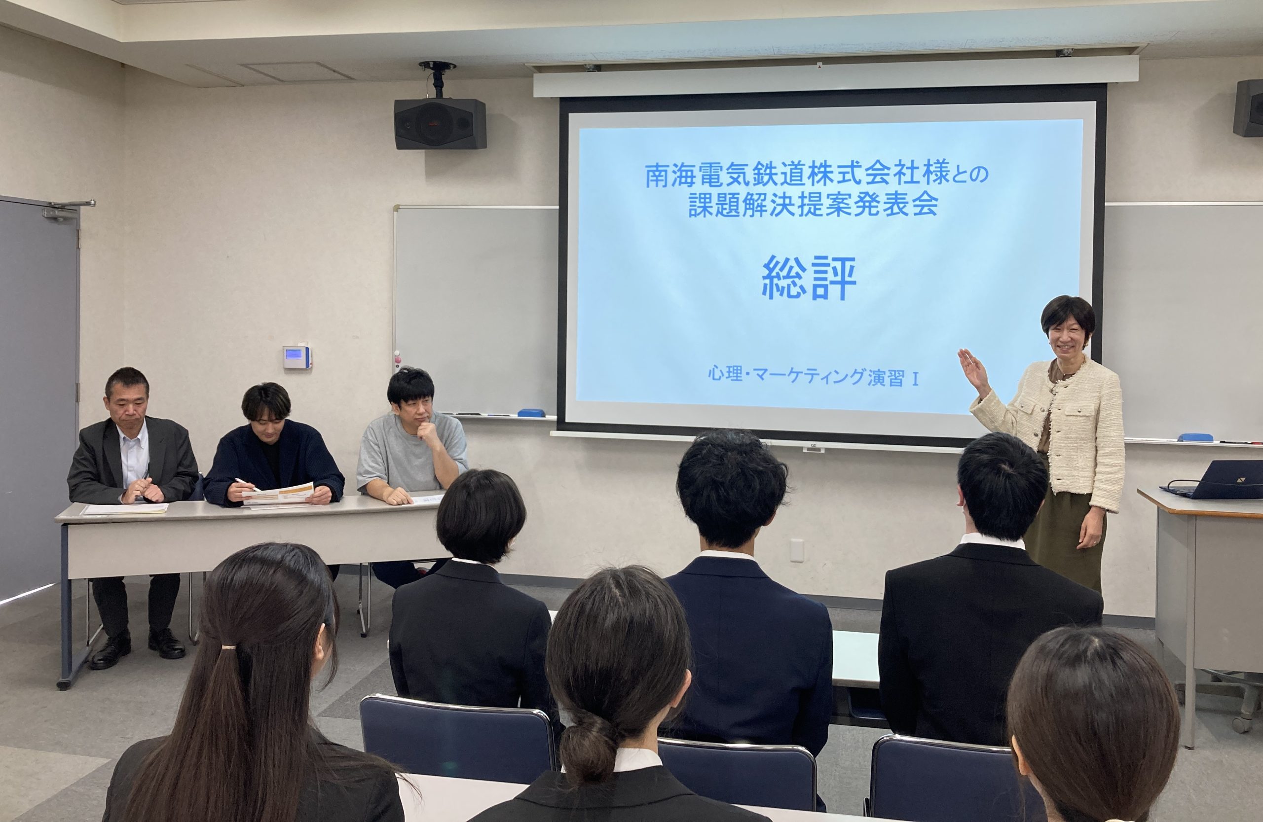 2年次生対象の心理・マーケティング演習Ⅰでは、10月に「なんばエリア」のフィールドワークを行いキックオフした南海電気鉄道株式会社様(以下南海電鉄様)との企業連携型PBL(企業連携型課題解決学習)について、課題解決提案発表会を開催いたしました。
