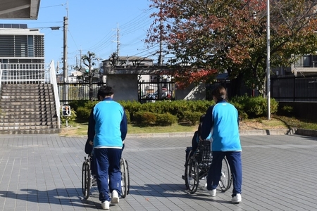 車いすの介助の方法を学ぶ授業ですが、同時に利用者がどのような気持ちでいるのかを学ぶ授業となっています。