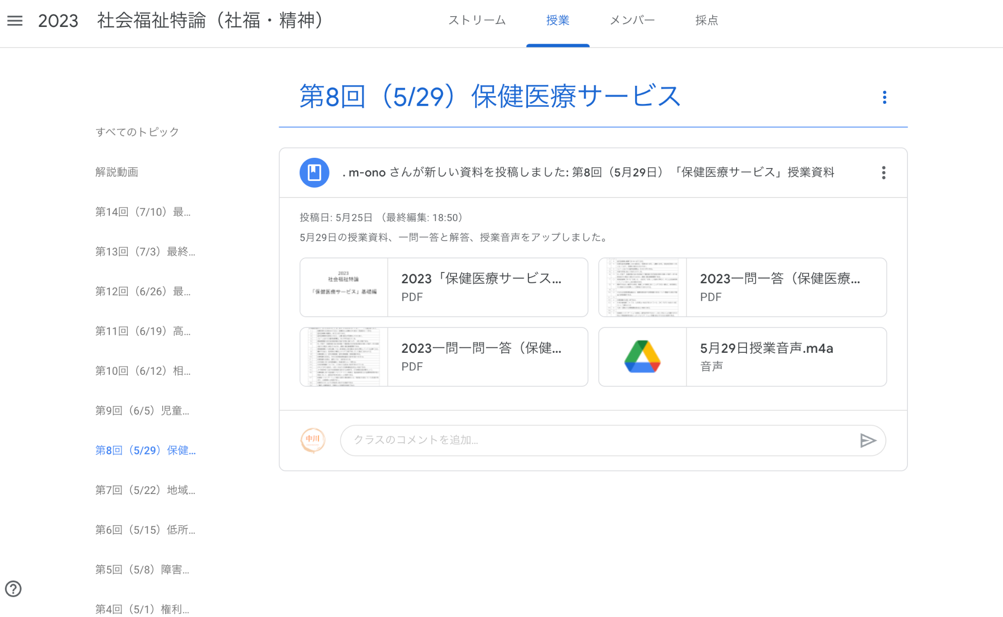 またGoogleクラスルームを用いて、毎回担当教員の授業レジュメと、音声データもアップし、学生の自学自習も応援しています。