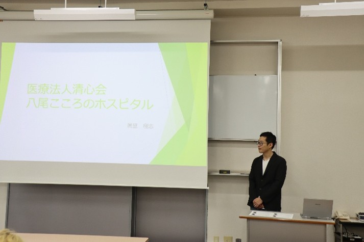 2年次生プレ演習(合同授業)で、10年前に大阪人間科学大学を卒業した眞壁さんより、学生時代から今の職場(精神科病院)で働くに至るまでの経験をお話しいただきました。