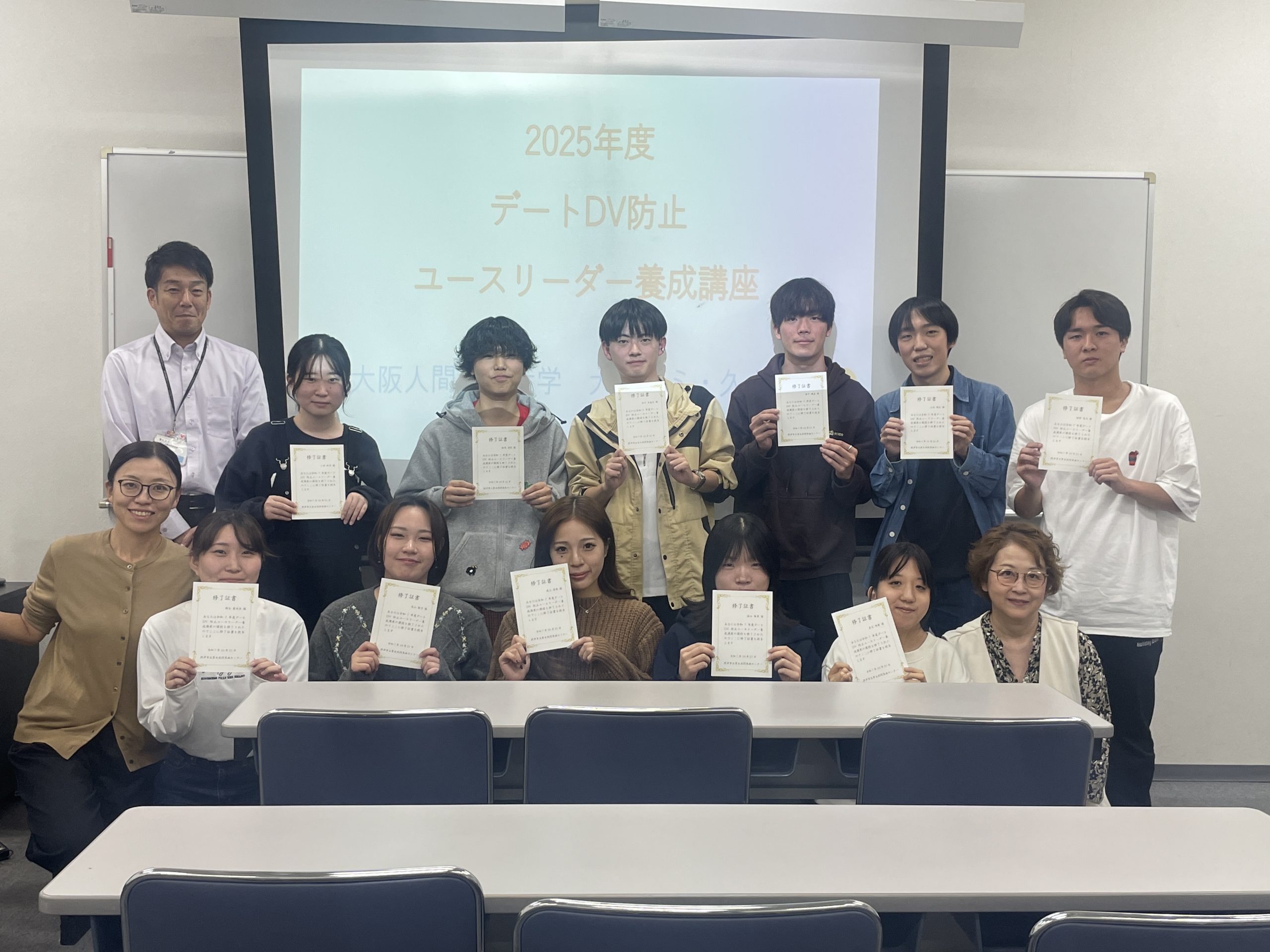 摂津市立男女共同参画センターと協働し、社会福祉学科の大野ゼミ・久山ゼミ3年次生を対象にデートDV防止ユースリーダー養成講座を開催しました。