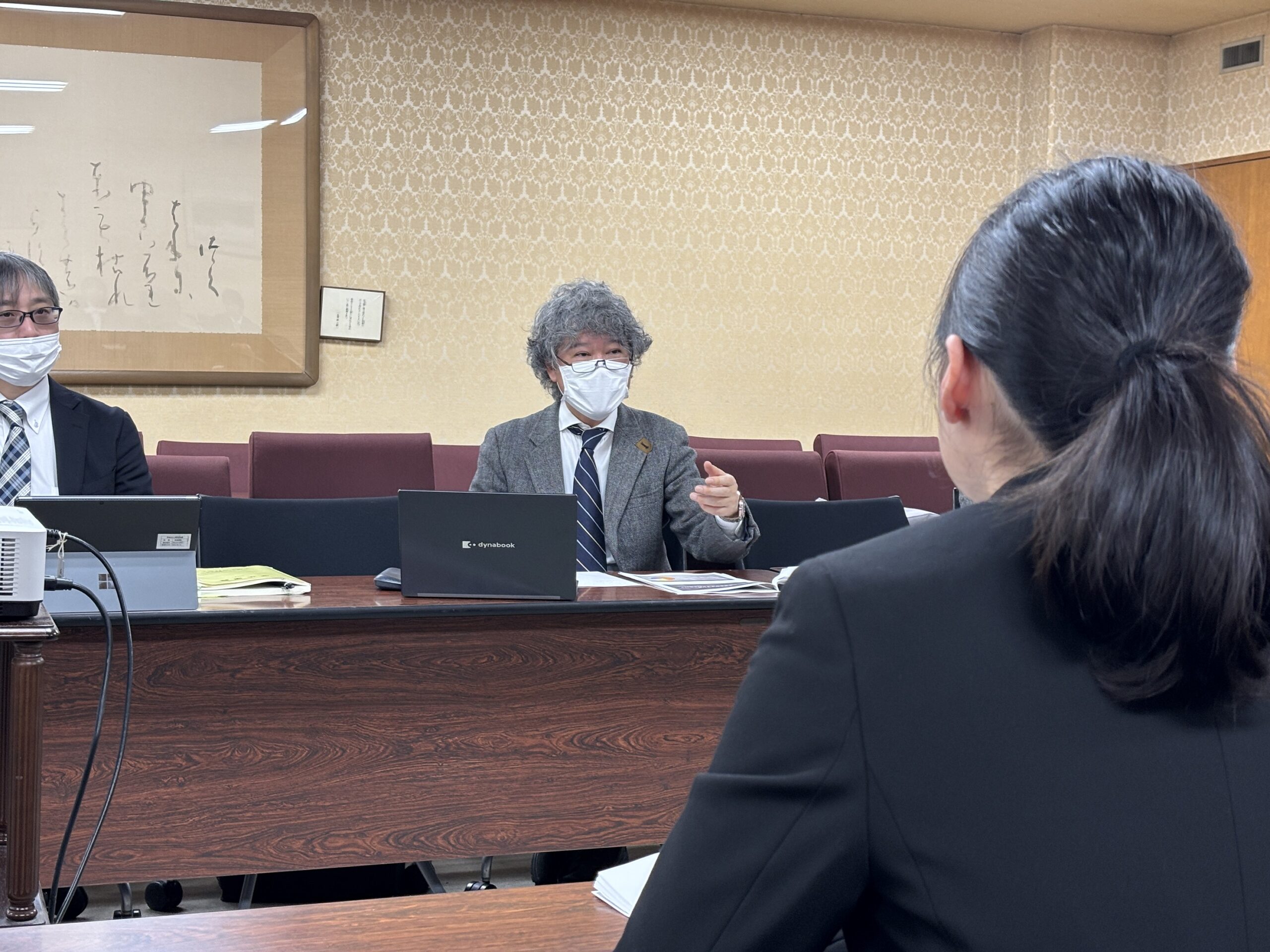 また、恒例となった「大学の自己点検評価に関する意見交換」を行い、履修モデルやカリキュラムツリーの活用状況・改善意見、国試対策や低年次からのキャリア支援の導入、キャリア関連授業の見直し等に関する意見が寄せられ、学長や教務担当部長からコメントが述べられました。