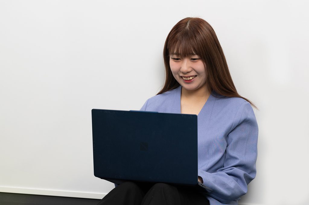 「コンピュータ技術」の授業はI〜Ⅳまでありますが、やってみたかったAdobeソフト(Illustrator、Photoshop、Premiere Pro)を使う授業なので、すごく楽しいですね。授業以外でも自分で気になったときは、先生に聞いてみたり、YouTubeなどを見て自習したりしています。また、グループワークをする授業も多いのですが、みんなの意見を聞いていると勉強になるし、グループの意見をまとめていく力が身に付いていく手応えがあります。