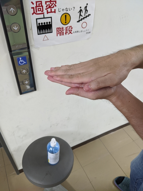 手でお椀を作ってそのくぼみに消毒液を溜めます。